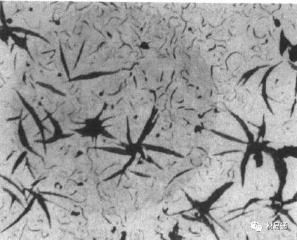 F型(星形)石墨,同C型石墨一樣,F型石墨也是初生石墨,是過共晶成分的鐵液在很大的過冷度下形成的(C型石墨是在小的過冷度下形成的),常出現(xiàn)在高碳薄壁鑄件中。由于是過共晶成分,所以鐵液冷卻時(shí)析出初生石墨,又由于冷卻太快,初生相不易長(zhǎng)大,而是分叉生長(zhǎng)成星狀,然后剩余液相發(fā)生共晶轉(zhuǎn)變,一般生成A型。F型石墨在通常鑄件中很難見到,在活塞環(huán)等高碳鑄件上常出現(xiàn);另外,添加合金硼的鑄件上常會(huì)出現(xiàn)F型石墨。