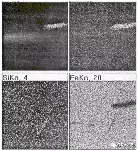 在金相觀察中選出待定夾雜物后,用電子探險針(EPMA)進行微區成分分析或者應用掃描電鏡(SEM)自帶能譜分析(EDS)進行成分分析。通常可以測定尺寸大于1um的夾雜物的組成元素和大致成分,如果采用個別元素的面掃描還可以得到更為直觀的結果。圖4是使用掃描電鏡對Q460鋼中的一顆夾雜物進行的面分析圖譜,依次進行硫、錳、硅和鐵四種元素的面掃描,從掃描結果可以推斷出,明場觀察中夾雜物為MnS、SiO2和FeS,通過能譜儀(EDS)對其進行成分分析,還可直接得到各元素的質量分數。
