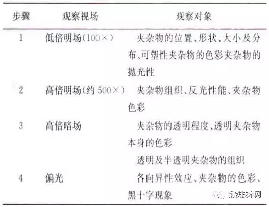 在光學顯微鏡下利用明視場觀察夾雜物的顏色、形態、大小和分布;在暗場下觀察夾雜物的固有色彩和透明度;在正交偏振光下觀察夾雜物的各種光學性質,從而判斷夾雜物類型。根據夾雜物的分布情況及數量評定相應的級別,評判其對鋼材性能的影響。目前檢驗和研究鋼中非金屬夾雜物的方法很多,有化學法、巖相法、金相法、電子探針和電子掃描法等。金相法鑒定夾雜物是根據夾雜物的形貌、分布及其在明場、暗場和偏光下的光學特征(表1),與已知的夾雜物特征對照以確定其類型。必要時可以測定夾雜物的顯微硬度或經受化學試劑腐蝕的能力。非金屬夾雜物的金相法鑒定步驟見表2。