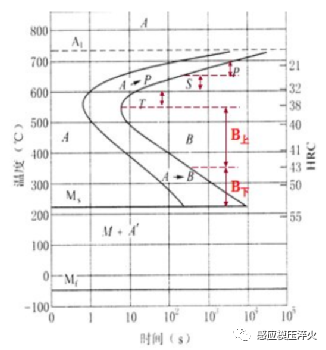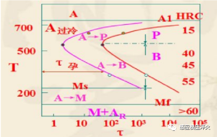 ⑤ 馬氏體是過冷奧氏體連續冷卻中的一種轉變組織,非等溫轉變產物。將其畫入,使過冷奧氏體等溫轉變曲線更完備、實用。