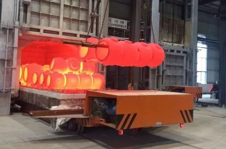 多用于碳含量較低的低硅、低磷、硫耐磨白口鑄鐵件,由于其合金元素的含量較高,碳化物難以溶解于奧氏體中。采用淬火處理(加熱溫度為9 50~1000℃)則使奧氏體中溶解更多的碳化物,冷卻后獲得較高硬度的馬氏體組織,從而確保了鑄鐵件有較好的耐磨性,為了減少內(nèi)應(yīng)力和避免開裂,也可采用硝鹽分級淬火,最后在180~200℃的溫度下回火1~3h。