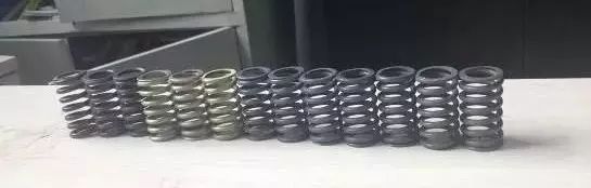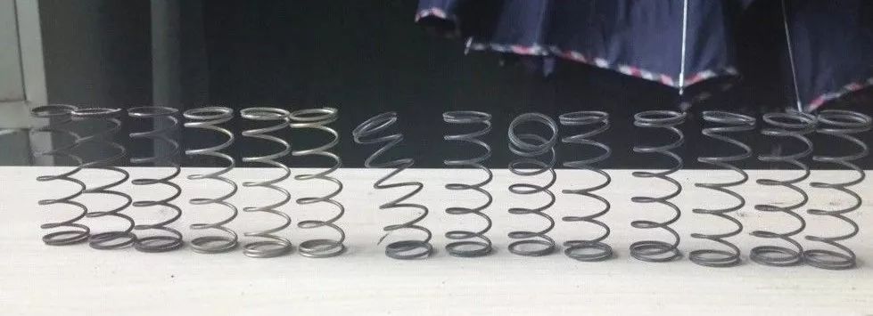 圖4 壓縮彈簧(注:左1~2未進(jìn)行表面處理;左3~5為鍍鋅處理件;左6~9為不帶芯桿滲鋅件;左10~12為帶芯桿滲鋅件)