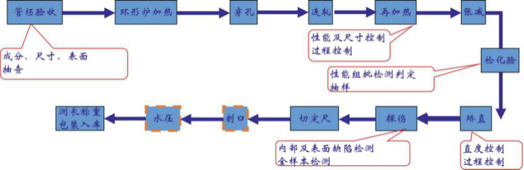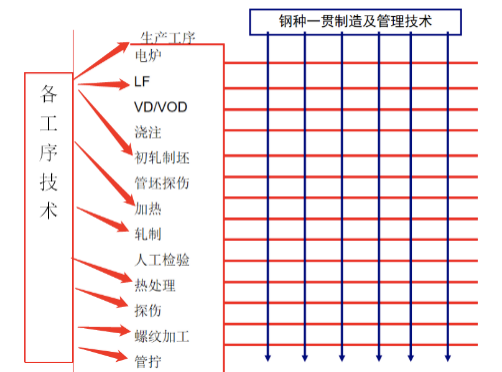 一貫指對質量管理的一貫制,即企業從接到訂單評審、質量設計開始到合同交付的全過程,主要的質量管理活動,包括原料選擇、冶煉、制坯、軋管、精整、包裝發貨等全過程,統一由質量管理部門一貫管理,每個工序的工藝設計是專門由一貫制部門全局設計的,具備很強的針對性和穩定性,全過程每個工序及質量控制點均會從產品設計、過程控制、結果管理上全局掌控,易于穩定控制質量(可參考圖一)。寶鋼股份有限公司就是一家典型的一貫制管廠。