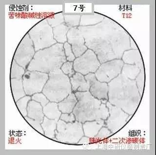 6、T12鋼-退火-黑白相間的層片狀基體為P,晶界上的白色網絡為Fe3Cll。7、T12鋼-退火-P+Fe3Cll,Fe3C染成黑色,P仍保留白色。
