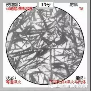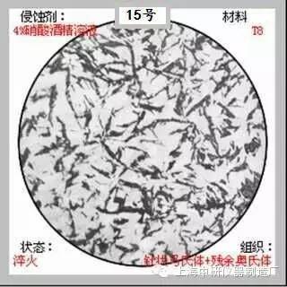 15、T8鋼-淬火-針狀M+Ar。高碳M呈針狀,互成一定的角度。