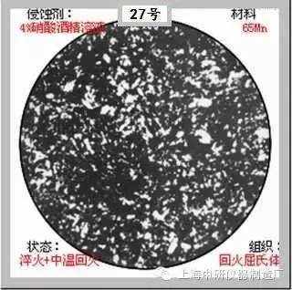 27、65mn淬火低溫回火-回火T。白色F基體上分布極細的黑色Fe3C顆粒,它仍保持M位向。