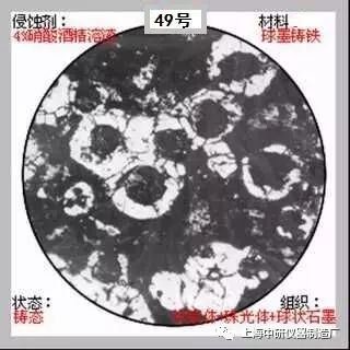 30、W18Cr4V退火-S+碳化物。基體為S,S呈暗黃色,白色塊狀為共晶碳化物,白色細小顆粒為二次碳化物。31、W18Cr4V淬火-M+Ar+碳化物。白色基體為隱針狀淬火M及Ar. 450X。32、W18Cr4V淬火及回火-M+碳化物+A殘。黑色基體為回火M+Ar,白色大塊顆粒為共晶碳化物,細小顆粒為二次碳化物。33、1Cr18Ni9Ti 固溶處理-A。白色晶粒為A晶粒,部分晶粒呈孿晶。34、30CrMnSi 等溫淬火 B粒。由灰白色F和它所包圍的小島狀組織所組成。35、ZGMn13 A+碳化物。白色基體為A,黑色網絡為晶界,沿A晶析出顆粒狀碳化物。36、20鋼 滲碳的平衡組織。最表層為過共析層,黑色基體為P,白色網絡為Fe3Cll。37、40cr 調質+軟氮化 軟氮化組織。白色表層為多相化合物,其結構一般為:Fe4N、Fe3N、CeN的混合組織。比較致密,余為回火索氏體。38、45鋼-滲B組織。表層白色為硼化物Fe2B相,呈現齒形契入基體中。39、灰口鑄鐵 HT的石墨形態。黑色片狀組織為石墨,因未作浸蝕,故基體未顯示,呈白色。40、可鍛鑄鐵-KT的石墨形態。黑色団絮狀組織為石墨,類似棉絮,外形較為規則。41、球墨鑄鐵 QT的石墨形態。黑色的球狀組織為石墨。42、蠕墨鑄鐵的石墨形態。蠕墨鑄鐵的石墨結構處于片狀石墨和球狀石墨之間,其特征石墨的長與厚之比值較小,片厚短,兩端都圓鈍。43、灰口鑄鐵-HT100 F基體灰口鐵。基體F為白色,并顯示黑色網絡晶界,F基體為上分布著黑色的片狀石墨。44、灰口鑄鐵-HT-150 F+P基灰鑄鐵。P呈黑色片狀,F分布于片狀石墨兩側呈白色,片狀石墨為黑灰色。45、灰口鑄鐵-HT-200 P基灰口鐵。灰黑的長片為石墨,基體為灰黑色教習的片狀珠光體。46、可鍛鑄鐵-KT350-10 F基可鍛鑄鐵。基體為F,呈白色,有明顯的黑色F網絡晶界。47、可鍛鑄鐵-KT550-04 P基可鍛鑄鐵。基體P呈黑白相間的層片狀。有的有小量白色F,黑色団絮狀為石墨。48、球墨鑄鐵-QT400-15 F基球墨鑄鐵。白色基體為F,黑色網絡為F晶界,黑色球狀為石墨。49、球墨鑄鐵-QT500-5 F+P基球墨鑄鐵。黑色球狀為石墨,白色F環繞于球狀石墨周圍,成為牛眼狀組織。50、球墨鑄鐵-QT700-2 P基球墨鑄鐵。黑白相間的層片狀為P,灰黑色球狀為石墨。51、高磷鑄鐵 P+片狀石墨+磷共晶. 層片狀基體為P,由于深浸蝕而成黑色;灰黑色為片狀石墨,白色棱角狀為磷共晶。52、ZL102-未變質的鋁硅合金。淺灰色粗大的針狀硅晶體與白色∝固溶體組成共晶組織+少量的淺灰色多邊形的初晶硅晶粒。53、ZL102 已變質的鋁硅合金。白色枝晶狀組織為初生∝固溶體,其余為灰黑色細粒狀硅與白色∝固溶體組成的共晶組織。54、LY12- 白色為∝(AL)基體與深黑色的[∝(AL)+θ相)CuAl2)+S相(Al2CuMg)]三元共晶及[∝(AL)+θ相)CuAl2)]二元共晶。三元、二元共晶均呈網絡分布,難于分辨。55、LY12-硬鋁的時效組織。白色∝(AL)基體上分布黑色θ相(CuAl2)及S相(Alo2CuMg)強化相質點。56、H70-單相黃銅組織。為鋅溶于銅中的∝固溶體等軸晶粒。有的晶粒含有孿晶。57、H62-雙相黃銅組織。白色部分為∝固溶體基體,黑色條塊狀是以電子化合物CuZu為基的β固溶體。58、QSn10-亮白色樹枝狀為錫溶于銅鐘的∝固溶體。∝樹干富銅,外圍較黑處富錫;樹枝間隙處白色中分布很細小的點為(∝+δ)共析體。δ是以電子化合物Cu31Sn8為基的固溶體。59、QSn10-∝固溶體單相組織,晶粒內有滑移帶。60、鎳基軸承合金-∝+β‘+η組織,白色方塊為β’相,放射針狀為η相,基體∝呈黑色。61、鎳基軸承合金∝+(∝Pb)+β)共+Cu2Sb)組織白色方塊為β相(SnSb)硬質點。部分針狀為銅銻化合物(cu2Sb),其余為(∝+(Pb)+β)共晶軟基體。62、45鋼-黑白相見層狀交替排列帶狀組織。白色晶粒為F,黑色塊狀為P。63、ZG30-低碳魏氏體。白色針狀、塊狀為F,黑色為P。64、T13-高碳魏氏體。黑色塊狀為P,白色網絡為Fe3C,Fe3C呈針狀插入、甚至穿透P晶粒。66、鐵基粉末冶金-鐵素體+珠光體+孔隙。白色基體為鐵素體,黑色粗片狀為珠光體,極少量條狀滲碳體,黑色顆粒為孔隙。