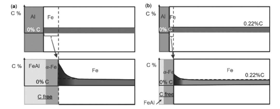 一般認(rèn)為,Al—Si涂層熱成形鋼 的斷裂應(yīng)變、抗冷彎角比無鍍層鋼板性能差,其原因是由無鍍層板熱沖壓表面脫碳引起。高韌性的薄Al—Si鍍 層技術(shù),通過控制Al—Si總量降低,降低合金化層中Al與Fe金屬間化合物的配位數(shù),降低基體表面的C富集程度,從而提高Al—Si鍍層熱成形鋼的塑性、抗冷彎和抗延遲開裂性能。該薄Al—Si鍍層熱成形鋼的熱成形前后鍍層結(jié)構(gòu)見圖。