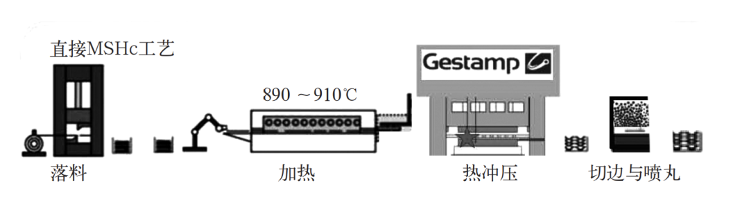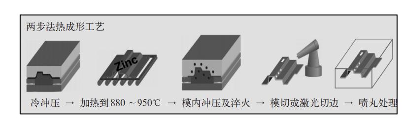 早期工業(yè)化生產(chǎn)熱成形鋼板,是通過間接熱成形的方法避免液態(tài)金屬脆化現(xiàn)象,也即“兩步法”熱沖壓成型(見圖)。