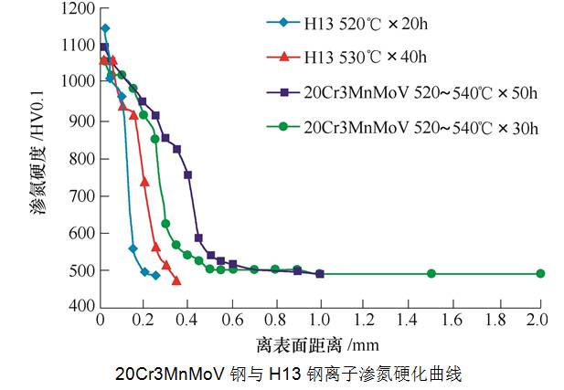 H13鋼520℃×20h滲氮,層深0.18mm,530℃×40h滲氮層深0.3mm,而20Cr3MnMoV鋼520℃×20h滲氮,層深0.3mm,530℃×40h滲氮層深0.5mm。