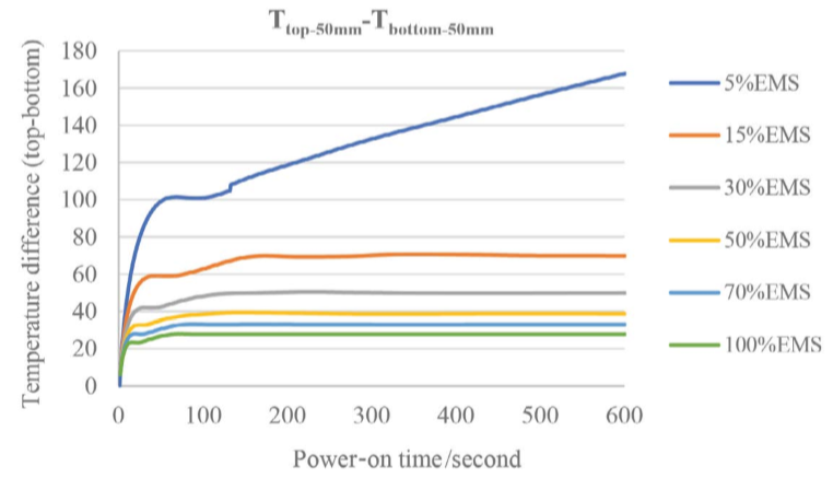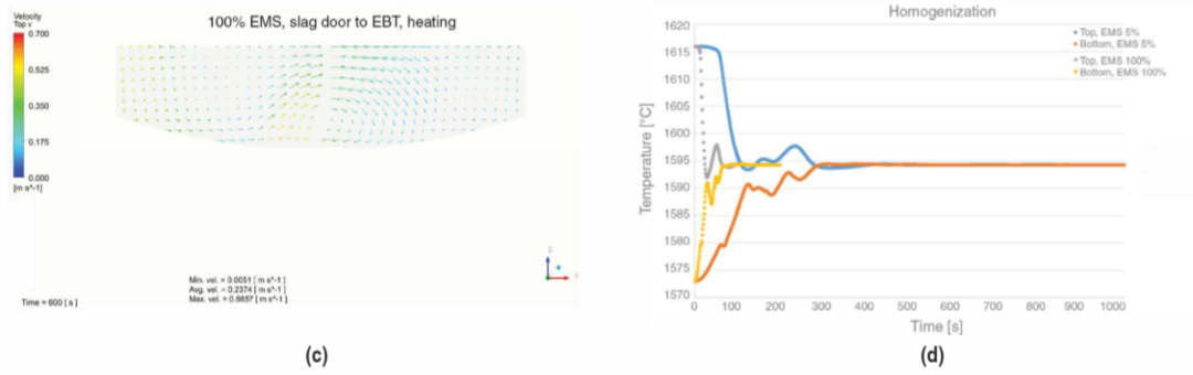 ?對于無攪拌的熔池,爐底溫度假設為1560℃,表面溫度為1620℃。然后比較EMS攪拌前后的溫度分布(均勻化時間差)。