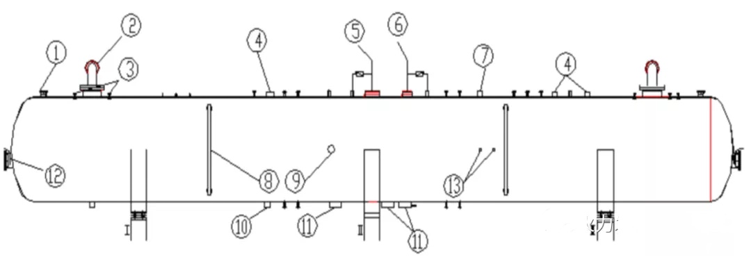 1、安全門 2、進水口 3、排氣口(每個噴嘴周圍四個) 4、再循環接口 5、四抽供汽接口 6、輔汽供汽接口 7、高加疏水接口 8、就地水位計 9、溢流口 10、放水口 11、出水口 12、人孔 13、壓力測點