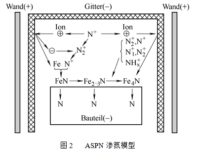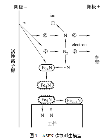 雖然Georges發(fā)明了ASPN技術(shù),但早期的ASPN技術(shù)的基礎(chǔ)研究都是在英國伯明翰大學(xué)表面工程研究室進(jìn)行的。Li C. X.等人通過試驗(yàn)發(fā)現(xiàn),ASPN可以獲得和DCPN一樣好的滲氮效果,并較好地解決了DCPN技術(shù)難題,是一項(xiàng)值得推廣的新技術(shù)。他們還在試驗(yàn)的基礎(chǔ)上,參照經(jīng)典的K?lbel離子滲氮模型上,最先提出了一個(gè)ASPN 的滲氮模型(見圖2),認(rèn)為從籠子表面濺射下來的Fe粒子與空間的N原子結(jié)合形成FeN粒子,這些粒子沉積在滲氮試樣的表面發(fā)生分解,釋放出來的活性氮原子滲入工件表面實(shí)現(xiàn)滲氮;在模型的右端,從籠子上濺射下來Fe4N粒子沉積在工件表面也能起到滲氮的作用,但其未解釋這部分的滲氮機(jī)制。