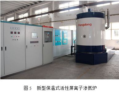 2012年江蘇豐東熱技術(shù)有限公司、青島科技大學(xué)以及江蘇省熱處理及表面改性工程技術(shù)研究中心三方合作,研制成功了具有特色和自主知識(shí)產(chǎn)權(quán)的新型活性屏離子滲氮設(shè)備(見圖5),并通過了中國熱處理行業(yè)協(xié)會(huì)組織的技術(shù)鑒定。該設(shè)備的籠子尺寸為φ1300×1500mm,工作臺(tái)直徑為1200mm。這套裝置采用了保溫式的爐體、雙測(cè)溫控溫系統(tǒng)、爐內(nèi)壓力雙閉環(huán)自動(dòng)控制系統(tǒng)、框式爐體升降移動(dòng)系統(tǒng)、快速充氮冷卻系統(tǒng)等多項(xiàng)專利技術(shù),特別是保溫式爐體,具有結(jié)構(gòu)簡單合理、升溫速度快、節(jié)能效果顯著等優(yōu)點(diǎn),可進(jìn)一步提高爐內(nèi)空間溫度均勻性。