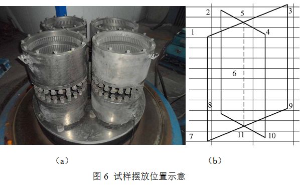 為了比較新研制的活性屏離子滲氮設(shè)備與普通的離子滲氮爐滲氮效果,分別在保溫式活性屏離子滲氮爐和LDMC-100F普通水冷壁式離子滲氮爐內(nèi)擺放了8個(gè)42CrMo內(nèi)齒圈,齒圈外形尺寸為φ500×500mm,每個(gè)齒圈重約70kg。在8個(gè)大齒圈的不同部位擺放了11個(gè)42CrMo試樣,擺放的位置見圖6。