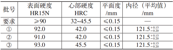 通過碳氮共滲淬火質(zhì)量改進(jìn)措施的實(shí)施和控制,統(tǒng)計(jì)了三批碳氮共滲淬火零件,對(duì)零件的硬度、平面度和內(nèi)徑尺寸進(jìn)行了檢測(cè),結(jié)果見表1。
