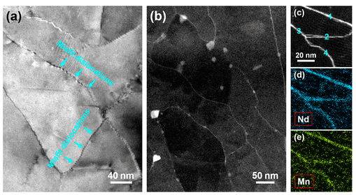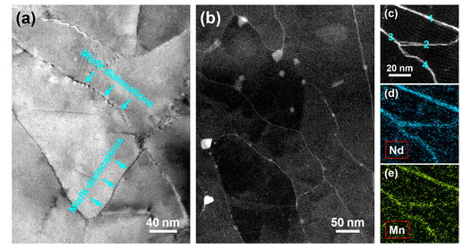 圖1.明場圖像(a)和HAADF-STEM圖像(b)顯示了Mg-2Nd-1Mn樣品中的多晶微觀結(jié)構(gòu),壓縮了25%,并在250°C退火1 h。這些微/納米級(jí)晶粒中的大多數(shù)具有彼此平行的<112 directions0>方向。(c–e)Mg-2Nd-1Mn合金的STEM-EDS映射結(jié)果。HAADF-STEM圖像(c)和與元素Nd(d)和Mn(e)有關(guān)的相應(yīng)EDS映射圖像。