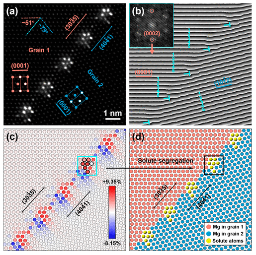 圖2.(a)原子尺度的HAADF-STEM圖像,顯示了沿<112→0>傾斜軸觀察的線性ATGB中的溶質(zhì)分離。傾斜角度θ 1 = 51°,θ 2 = 79°(I型)。(b)相應(yīng)的經(jīng)傅立葉濾波的原始相位圖像,顯示了線性邊界中五個(gè)(0001)G1 /(101?2)G2原子層分離的MD的陣列。(c)Voronoi分析圖,顯示壓縮和延伸位點(diǎn)交替分布在純鎂線性ATGB上。(d)I型界面上層結(jié)構(gòu)的溶質(zhì)離析模型。