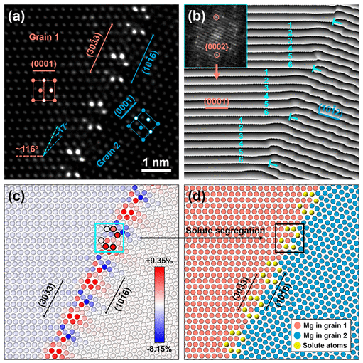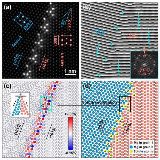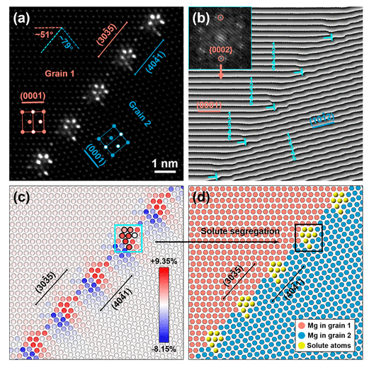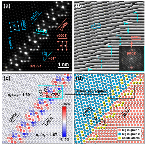 圖5.原子尺度的HAADF-STEM圖像,顯示了沿<112→0>傾斜軸觀察的線性STGB中的溶質(zhì)分離。傾斜角為θ 1 = 51°,θ 2 = 49°(IV型)。(b)相應(yīng)的經(jīng)傅立葉濾波的原始相位圖像,顯示了線性邊界中三個(gè)(0001)G1 /(11?00)G2原子層分離的MD的陣列。(c)Voronoi分析圖,顯示壓縮和延伸位點(diǎn)交替分布在純鎂線性STGB上。(d)IV型界面上部結(jié)構(gòu)的溶質(zhì)分離模型。