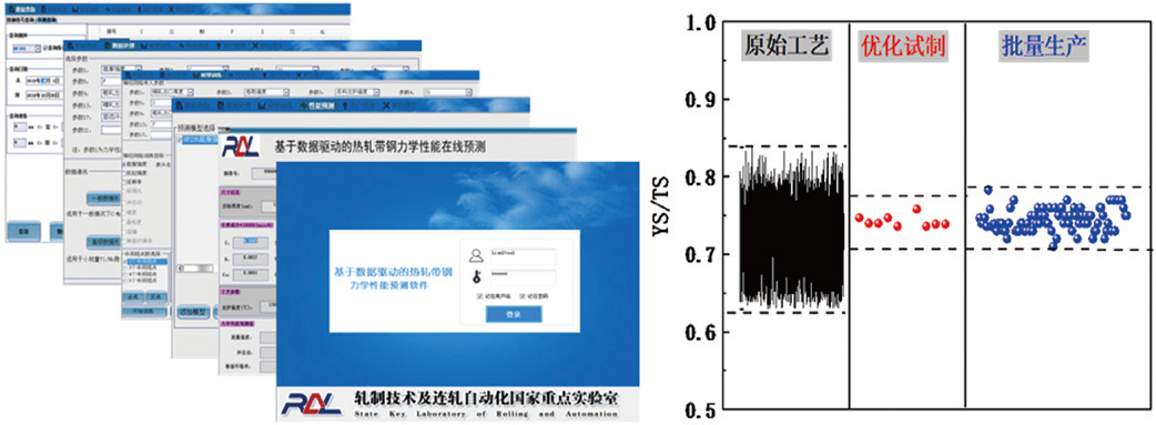 劉振宇:我們開發的以組織性能預測與優化為核心的鋼鐵智能化制造技術已在鞍鋼2150、梅鋼1422和梅鋼1780、承鋼1780、漣鋼2250以及韓國現代鋼鐵熱軋生產線進行了推廣應用。在鞍鋼2150熱連軋生產線開發出焊瓶用鋼屈強比波動控制技術,解決焊瓶鋼屈強比窄幅(0.735-0.785)控制這一軋鋼領域的世界性難題,使此類產品的屈強比波動降低至原來的1/4,大幅提高了產品的合格率(圖2);開發出厚度為9-12mm結構板材Q345B升級Q390B的軋制技術,生產出的鋼板性能穩定。在梅鋼1422和1780熱連軋生產線,通過組織性能預測與工藝優化,鋼種牌號已減少60%以上,實現了熱軋集約化、綠色化生產,大幅促進了企業節能減排;同時,針對厚度為2.5mm的汽車車輪用鋼,通過組織性能預測與工藝優化,使鋼中錳含量降低一半,噸鋼節約材料成本約50元。依托承德1780產線,在國際上率先實現了結構用鋼帶卷性能的通長預測,為熱軋產品穩定性控制提供了手段。此外,熱軋鋼材表面氧化鐵皮形態的軟測量和工藝優化系統成功地輸出至韓國現代鋼鐵,為其產品表面質量控制提供模型依據。
