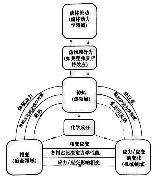 因為淬火冷卻介質是液體或氣體,所以淬火冷卻介質的流體動力學對于定義工藝過程中的吸熱很重要。圖1 中給出了造成不同領域相互影響的原因。例如,冶金領域的變化(每種顯微組織容積率的變化)會帶來兩個改變熱領域的影響:相變潛熱的釋放速率和熱物性參數值(取決于溫度和相分布)。