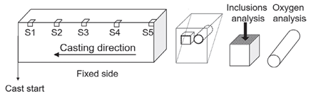 軸承鋼的超高性能的日益增長的需求要求嚴(yán)格控制鋼中的非金屬夾雜物。[1~6]對軸承鋼中夾雜物在煉鋼初煉[7]、精煉[8,9]、鈣處理[10]、連鑄[11]和電渣重熔[12,13]過程中的演變和轉(zhuǎn)變進(jìn)行了大量的研究,以及少量在鋼的冷卻和凝固過程中夾雜物成分轉(zhuǎn)變的研究。[14,15]最近一些年來,鋼中夾雜物的瞬態(tài)演化調(diào)研吸引了大量關(guān)注,使用動力學(xué)模型來預(yù)測了在精煉過程中鋼水夾雜物成分上的變化,[16~27] ,以及在在鑄坯加熱過程中的變化。[26~32]使用流體流動,熱傳遞和凝固,鋼中夾雜物的碰撞和運(yùn)動,對連鑄坯橫截面上的夾雜物的空間分布和尺寸大小進(jìn)行預(yù)報,[31,33~35] 作者預(yù)報了在重軌鋼鑄坯中夾雜物在空間上的分布,[36]然而,估計軸承鋼的夾雜物成分的空間分布少有報道,這恰恰是對鑄坯產(chǎn)品的夾雜物的精確控制非常重要。