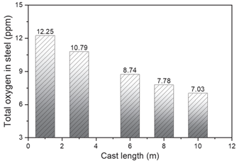 圖3顯示了頭坯試樣的T.O,連鑄開澆時,連鑄開澆起步的時候,由于鋼水的二次氧化造成全氧含量高達(dá)12ppm,然后隨著鑄坯長度的增加,鋼中的T.O含量逐漸降低,當(dāng)鑄坯長度為10 m時,T.O含量約為7ppm。起步開澆時候的高全氧含量是非穩(wěn)態(tài)澆鑄導(dǎo)致的,反映在鋼液的二次氧化。由于連鑄機(jī)中間包和結(jié)晶器在澆注前都充滿了空氣,所以在澆注開始階段,鋼水與空氣充分結(jié)合,導(dǎo)致嚴(yán)重的二次氧化。隨著鑄坯長度的增加,澆鑄過程變得越來越穩(wěn)定,反映在全氧含量上的減少,如圖3所示。鑄坯長度為10 m之后,全氧含量仍然在降低過程中,表明連鑄過程仍處于非穩(wěn)態(tài)。