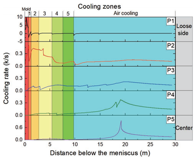 圖21 計算冷卻速度在5個位置與間隔距離從內(nèi)弧一邊到鑄坯的中心