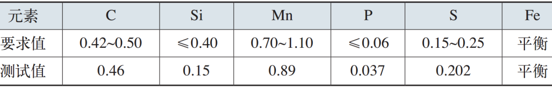 對斷裂的噴油嘴螺栓進行取樣,經直讀光譜儀進行化學成分分析,結果如表1所示,顯示螺栓的化學成分均符合易切削鋼46S20的規范要求(EN 10277-3:2008)。46S20屬硫系易切削鋼牌號,適用于制造對力學性能要求不高的各種零件,如螺栓、螺母等。