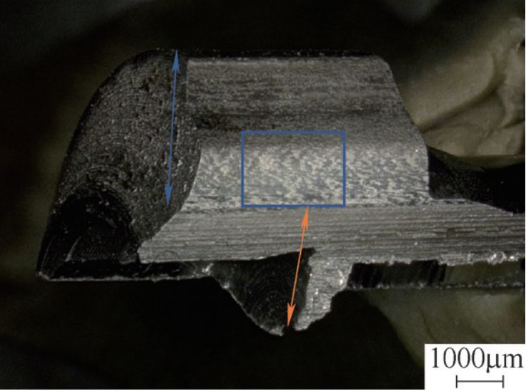 從隨機挑選的斷裂螺栓中心孔將其切開,斷裂面自然打開,如圖2所示。圓柱頭圓周面向內很大深度范圍內(藍色雙箭頭所示)斷裂面較為平整,表面呈現出明暗相間的花紋,藍色方框放大后發現其具有高溫氧化的跡象(見圖3);新鮮斷裂面如圖2黃色雙箭頭區域所示,該段屬于裝配工序產生的裂紋,線性起源于高溫氧化區域的末端,向中心孔的方向擴展。斷裂面具有明顯的宏觀臺階狀特征,無塑性變形。