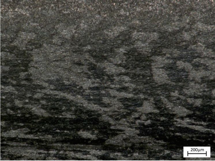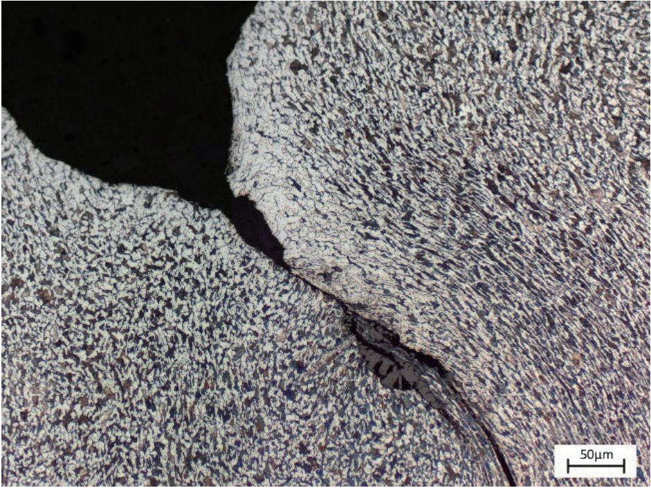 結合金相組織與體視學形貌的觀察結果,可判定外圓周面向內平滑段裂縫其實并非真正的裂紋,而是符合熱鍛成形工藝中產生的高溫折疊特征,并伴有一定深度的氧化與脫碳現象。對同批次未經使用的新螺栓進行抽檢,螺栓圓柱頭部也發現了折疊缺陷,如圖7所示。試樣經侵蝕后發現,折疊附近的微觀組織結構具有與折疊大致平行的加工流線特性,具有明顯的高溫脫碳特征,且存有一處較大的氧化物夾渣,如圖8所示。