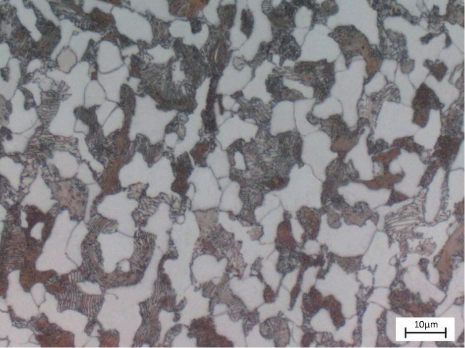 沿另一個隨機挑選的斷裂螺栓圓柱頭部制取橫截面金相試樣,金相觀察發現,從外緣向內至約1/2壁厚處,裂縫走向較為平滑,然后轉為曲折(見圖4)。低倍下觀察,平滑段裂縫兩側具有泛白的特征。高倍下觀察,平滑段裂縫附近具有明顯的高溫脫碳特征,脫碳層深度可達0.15mm,如圖5所示;而正常區域組織為珠光體加鐵素體,晶粒細小,如圖6所示。