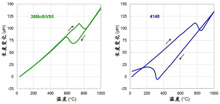 圖1:(a)熱軋38MnSiVS5鋼和(b)熱軋4140鋼的長度隨溫度的變化。
