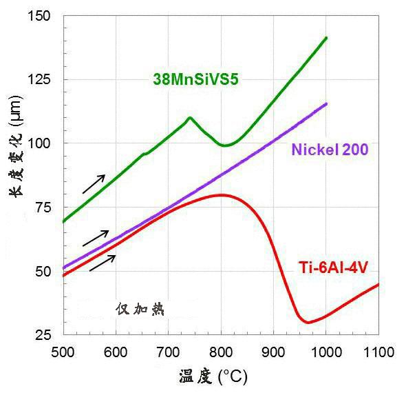 圖2:加熱38MnSiVS5鋼,市售純鎳(鎳200)以及普通鈦合金(Ti-6Al-4V)時,