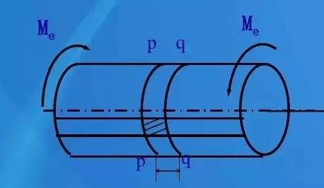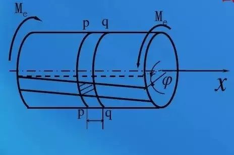 在軸表面作圓周線和縱向線,在扭轉(zhuǎn)力偶矩作用下,圓周線長度形狀不變,各圓周線間距離不變,只是繞軸線轉(zhuǎn)了一個微小角度;縱向平行線仍然保持為直線且相互平行,只是傾斜了一個微小角度。變形如圖所示。