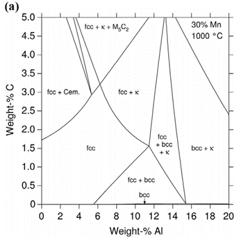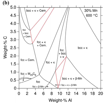 低密度Fe-Mn-Al-C鋼的特征有單相(bcc-鐵素體/fcc-奧氏體)或雙相(鐵素體+奧氏體)結(jié)構(gòu),這取決于合金含量和熱機處理,具有復雜分布的碳化物。在低密度鋼中,最為關(guān)心的碳化物是MCM3C、M23C6M7C3型碳化物,以及有序的fcc (L’12)(Fe, Mn)3AlC碳化物,即κ-碳化物。[16 – 19] 通常,計算Fe–Mn–Al–C鋼種等溫截面的相圖強烈依靠熱力學數(shù)據(jù)庫,有不同的描述報道。相圖顯示了鋁含量擴大了鐵素體相范圍,抑制奧氏體相范圍的總體趨勢。這些圖還預測到,對于給定的Al含量,奧氏體區(qū)隨著CMn含量的增加而增大。圖2顯示了由PrecHiMn-4數(shù)據(jù)庫計算的1 000℃(a)600℃(b)下奧氏體Fe-30Mn-Al-C鋼的等溫相截面。[19]這些圖表明,奧氏體在低Al含量(<6 wt.%)時是穩(wěn)定的。隨著C含量的增加,高鋁鋼中的奧氏體穩(wěn)定性也隨之提高(例如,添加1 wt.% C可增加奧氏體相的穩(wěn)定性,其鋁含量直到9 ~ 10 wt.% Al)。這些圖也表明在Fe–Mn–Al–C鋼奧氏體中κ 相穩(wěn)定性是需要高鋁和高碳的。在600℃時,Al >5 wt.%, C >1 wt.%時形成κ-碳化物。低Al含量(Al <6 wt.%)時,可形成滲碳體和M23C6型碳化物,而不是κ型碳化物。有趣的是,這張圖也揭示了奧氏體、鐵素體、滲碳體和κ-碳化物在特定的AlC含量范圍內(nèi)是穩(wěn)定的。例如,在高C含量(>1 wt.%C)下,可以發(fā)生κ-碳化物和滲碳體組合形式,另一方面,在高Al含量(>9 wt.%Al)時,鐵素體、奧氏體和κ-相在有限的C含量范圍內(nèi)穩(wěn)定。這些特征表明,為了促進κ-碳化物在奧氏體中的析出,必須嚴格控制C含量和退火溫度??梢钥闯觯?/span>1 000℃時,κ-碳化物只有在CAl含量較大時才穩(wěn)定,如C >1.5 wt.% - Al >12 wt.%C > 3wt.% - Al > 6 wt.%,這與實際使用的成分范圍不相關(guān)。