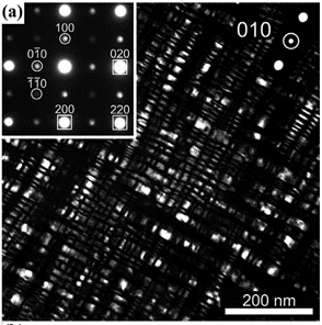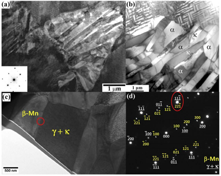 5  (a)Fe - 30.5Mn– 8Al - 1.2 C鋼奧氏體鋼退火在600°C96小時,[ 33]亮場的TEM圖像κ碳化物沿兩個相鄰奧氏體顆粒γ1γ2晶粒邊界之間析出 (b)Fe- 18Mn -7.1Al - 0.85 C鋼退火在650°C保持100小時,亮場的TEM圖像αγ/κ層狀結(jié)構(gòu);[30]  (C)550℃退火500 hFe-31.4Mn-11.4Al-0.9 C奧氏體鋼中β-Mn析出物的亮場TEM圖像,(D):在γ-基體/β-Mn中間相邊界衍射模型。[39]
