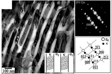 鐵素體Fe-Mn-Al-CMn含量低(< 5 wt.%), Al含量為5 - 9 wt.%, C含量低(< 0.1 wt.%)。這些鋼中還可能添加Si、Nb、Ti、VTa等元素,以促進MC型碳化物的析出和晶粒細化。在熱加工條件下,這些鋼沿軋制方向出現(xiàn)了δ-鐵素體的延伸的晶粒組織,形成帶狀組織。在連鑄過程中,δ-鐵素體直接從液態(tài)產(chǎn)生,根據(jù)合金含量的不同,奧氏體相在熱機處理后發(fā)生γ→α′馬氏體相變,在鐵素體基體中形成宏觀馬氏體帶。[21,23]鋁含量強烈地改變了這類鋼鐵素體基體的晶體結(jié)構(gòu),當Al >7 wt.%時,δ相發(fā)生有序轉(zhuǎn)變,形成復雜的立方結(jié)構(gòu),如FeAl化學計量學的B2結(jié)構(gòu)相和Fe3Al化學計量學的DO3結(jié)構(gòu)相。根據(jù)鋁含量的不同,δ-基體相可以是A2 -無序的FeAl、B2 -有序FeAlDO3 -有序Fe3Al。通過冷軋和微合金化NbTi、V、B等元素來細化晶粒。在這些鋼中,由于在δ 相和 κ碳化物之間高的晶格錯配(晶格錯配~6%),κ碳化物是半共格界面的,導致了組織棒狀延伸,見圖3。(011)δ//(111)κ -碳化物的取向關(guān)系對應于Nishiyama-Wasserman關(guān)系,即(011)δ//(111)κ。最近用原子探針斷層掃描(APT)鐵素體Fe - 3.2Mn – 10Al - 1.2Cκ碳化物的化學結(jié)構(gòu)分析,展現(xiàn)了這些碳化物非化學計量上的結(jié)構(gòu)。[25]這份報告展現(xiàn)的κ-碳化物非化學計量是由于部分替代AlFeMn在面心立方結(jié)構(gòu)晶胞的角落里位置,根據(jù)C含量和冷卻速度的不同,可以沿晶界形成粗大的κ-碳化物。