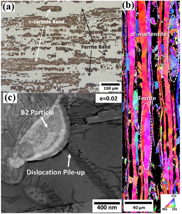 - 鐵素體和鐵素體基雙相鋼的拉伸性能主要由鐵素體的應變硬化能力[3,9,43]和粗晶間κ-碳化物的形成控制。鋼中演變的位錯亞結(jié)構(gòu)是典型的鐵素體鋼。[9,11,59]在鐵素體基雙相鋼中,奧氏體晶??砂l(fā)生應變誘導的α′-馬氏體相變,在高應力水平下可形成變形孿晶。由于TRIP(相變誘導塑性)TWIP(孿生誘導塑性)效應的激活,這些效應導致了增強的應變強化的能力。TRIP效應的效率取決于亞穩(wěn)奧氏體的結(jié)晶取向及其對應變誘導馬氏體形成的力學穩(wěn)定性。