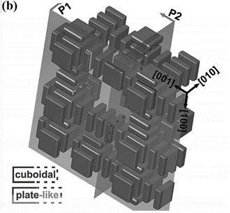 奧氏體Fe-Mn-Al-C鋼的特征是高Mn含量(15-30 wt.%),高Al含量(2-12 wt.%),高C含量(0.5-2.0 wt.%),這類低密度鋼在熱加工條件下表現(xiàn)出完全等軸晶奧氏體組織。合金的析出行為和γ→α相變特征取決于冷卻速率和AlC含量,特別是,鋁含量高(> 9 wt. %)促進扭曲的鐵素體的形成,以及沿著晶界有序的B2DO3析出。[9]從力學的角度來看,κ-碳化物(L1’2的相)是最為相關(guān)的,鋼中雖然其它碳化物的析出,即M23C6M7C3, M3C,也是可以影響力學性能。在奧氏體Fe-Mn-Al-C鋼中,κ-碳化物的形成需要較高的AlC的含量,即Al >5 wt.%C >1 wt.%(見圖2)Κ-碳化物是共格和半共格析出(晶格錯配<2%),與奧氏體是立方到立方晶胞位相關(guān)系,即[100]κ//[100]γ [010]κ//[010] γ 。最近原子探針的分析斷層掃描(APT)結(jié)合基于密度泛函理論(DFT)計算顯示的非化學計量κ-碳化物在奧氏體Fe-29.8Mn-7.7Al-1.3C鋼的結(jié)構(gòu),[35, 37]特別是,APT已經(jīng)證實亞晶格已經(jīng)耗盡了間隙原子C和代位原子Al。  這一效應歸因于MnγAl反位點(假設(shè)MnγAl反位點與周圍基體處于熱力學平衡)κ-碳化物共格引起的壓縮彈性應變下能量上的積累。κ-碳化物分布是沿三個正交<001>方向上直徑約為10 ~ 50 nm的立方狀和板狀析出相復雜的三維排列。用透射電鏡(TEM)κ-碳化物的二維分布進行了分析,結(jié)果顯示在<100>方向的納米級析出物相呈邊帶分布,圖4(a) [15]原子探針斷層掃描(APT)κ-碳化物的三維分布進行了分析,最近發(fā)現(xiàn)κ-碳化物以不同粒子間距堆棧方式密集分布,圖4(b)、4(c).15),沿同一堆棧分布的κ-碳化物的粒子間距約為2-5 nm(4(c)中狹窄的γ通道)。κ-碳化物沿不同層分布的粒子間距約為10-40 nm(4(c)所示較寬γ通道)。