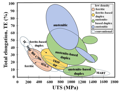 幾種低密度Fe-Mn-Al-C鋼的室溫延伸率(TE)與極限拉伸強度(UTS)曲線。研究了幾種常規(guī)高強度鋼的拉伸性能,即IF (無間隙原子鋼)、軟鋼、BH (烘烤硬化鋼)、碳錳鋼、HSLA(高強低合金)TRIP(相變誘導塑性)、DP(雙相)MART(馬氏體)