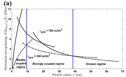 -奧氏體鋼的拉伸性能較強,如固溶強化,由于微粒剪切和沉淀析出有序強化,即Orowan位錯環(huán)。Yao等人最近對Fe-Mn-Al-C奧氏體鋼的強化機理進行了分析,圖8(a)總結(jié)了他們的分析。這張圖顯示了標準化強度(標準化相對于體積分數(shù),Vf)  作為平均析出微粒半徑r的函數(shù),反相邊界(APB)能量的兩個值,γAPB。用ab-initio方法計算了這兩種不同相結(jié)構(gòu)的κ-碳化物能量,一個含碳的γAPB, ~700 mJ/m2,另一個無CγAPB ~350 mJ/m2,從圖中可以看出,隨著析出的粒子r尺寸的增大,強化機制由弱耦合顆粒剪切向強耦合顆粒剪切轉(zhuǎn)變。此外,從圖中可以看出,對于高r(r > 40 nm),主動強化機制為Orowan位錯環(huán)強化。圖中還顯示,當γAPB值較高時,強化峰值應力增加,使用粒子半徑來界定不同的強度方法是減弱的。值得指出的是,對于常規(guī)尺寸的κ-碳化物(10-40 nm),從圖中可以看出,顆粒剪切是主要的強化機制,同意實驗的觀察,[2, 4, 6, 9,15,38,45]8 (b)顯示了一個示例的κ硬質(zhì)合金剪切Fe - 30.4Mn – 8Al - 1.2 C鋼,拉伸真應變0.02,[15] Orowan位錯環(huán)依然有助于這個大的間距粒子之間區(qū)域,即廣泛γ-通道,見圖4 (C)。