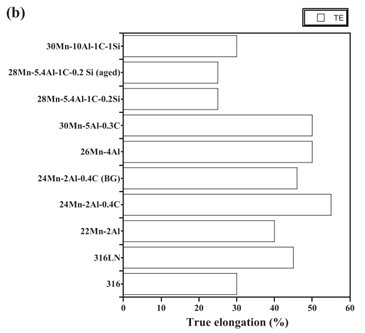 - 奧氏體鋼表現(xiàn)出良好的拉伸性能組合,即UTS600-1 100 MPa, TE40-100%。