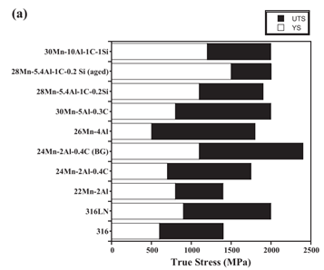 - 奧氏體基雙相鋼的拉伸性能是由奧氏體的應變強化的能力、可剪切的κ-碳化物和不可剪切的B2析出相的形成以及鐵素體晶粒的大小控制的。