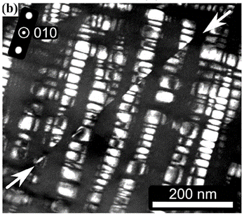 鐵素體基雙相鋼含有中等Mn含量(3-10 wt.%) Al含量(5-9 wt.%)和低C含量(< 0.4 wt.%)[10,44,48]這些鋼具有復雜的雙模態(tài)的δ-鐵素體和奧氏體沿著軋制方向的帶狀組織,見圖6a),奧氏體帶的相結(jié)構(gòu)強烈地依賴于Mn含量和退火處理條件。奧氏體部分或完全轉(zhuǎn)變?yōu)檠啬赶?/span>γ晶界或在δ/γ界面處形成的(α + κ)片狀領(lǐng)域,層狀(α + κ)結(jié)構(gòu)的特征是細長的棒狀半共格的κ-碳化物。高Mn含量時,抑制了γ→α + κ的分解,出現(xiàn)了γ→α′的馬氏體相變。[46,47]奧氏體機體為主的雙相Fe-Mn-Al-CMnAl含量較高(Mn > 25 wt.%Al > 9 wt.%)Al含量為5 ~ 12 wt.% C含量為0.6 ~ 1.2 wt.%[3,8,8,11,12,32,43.,45,47,49,50] 在淬火態(tài)時均表現(xiàn)出充分的奧氏體組織。在500-800℃溫度時效后,沿奧氏體晶界可形成復雜的鐵素體帶結(jié)構(gòu)。另一方面,鐵素體基雙相鋼具有復雜的δ-鐵素體帶狀結(jié)構(gòu)和沿軋制方向延伸的奧氏體條帶,如圖6(b)所示。從圖中可以看出,奧氏體可以發(fā)生應變誘導的α′-馬氏體轉(zhuǎn)變。除了L ' 12 κ-碳化物的形成外,最近還提出了幾種促進有序B2型析出相形成的析出策略。添加鎳和銅約3 - 5 wt. %,使非剪切的 B2-type析出物在奧氏體帶析出,導致增強機械性能。[8, 12,50]作為一個例子,圖6 (c)顯示在Fe-12Mn-7Al-0.5C-3Cu鋼中,B2富銅析出物界面位錯的聚集。根據(jù)合金含量和退火條件,鐵素體條帶可以含有B2析出物,κ-碳化物和奧氏體晶粒。κ-碳化物是通過共析分解γ→α + κ形成的。