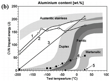 - 奧氏體基雙相鋼比鐵素體基雙相鋼具有更優(yōu)越的拉伸性能,這些鋼通常表現(xiàn)出UTS600-1 400 MPa20-60% 的延伸率TE,特別是,添加NiCu的奧氏體基雙相鋼表現(xiàn)出了吸引人的機械強度組合(屈服應力>1.0 GPa;UTS > 1.5GPa;適中的延伸率:20 - 30%),高Al含量鋼(Al >10 wt.%)中含有高體積分數(shù)的納米尺寸的κ-碳化物、粗大的晶間κ-碳化物和α-微粒,這種析出行為導致了鋼的高強度(~1 400 MPa),有限的TE(<10%)和高機械性能的各向異性。