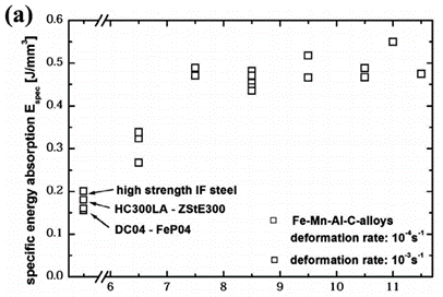 低密度Fe-Mn-Al-C鋼展現(xiàn)出高的能量吸收行為,相比于常規(guī)的深沖性能鋼,像DC04,HC300LA,高強度IF鋼,見圖10a)。[1]Al >7 wt.%時,Fe-Mn-Al-C鋼的Espec值約為0.5 J/mm3;比傳統(tǒng)的深沖鋼(0.16-0.25J/mm3)50%左右,Espec是給定溫度、高應變速率下單位體積的變形能,高應變率下,Fe-Mn-Al-C鋼的能量吸收增強是由于剪切帶的形成。Fe-Mn-Al-C鋼的沖擊韌性與微觀組織有強烈相關(guān)關(guān)系,特別是取決于κ-碳化物的形成和δ-鐵素體的存在。[13] Al含量對這些鋼的沖擊韌性起著重要的調(diào)節(jié)作用。當Al <7wt.%時,發(fā)生Fe3CM7C3碳化物晶界析出,惡化了鋼的塑性和韌性。當Al >7 wt.%時,由于κ-碳化物體積分數(shù)的增加和δ-鐵素體的形成,機械強度提高,但塑性和沖擊韌性降低。后者由于γδ相之間的變形不協(xié)調(diào)而導致沖擊韌性的大幅度下降,圖10(b)顯示了幾種奧氏體Fe-Mn-Al-C鋼在不同退火條件下的夏比V形缺口(CVN)沖擊功隨測試溫度的變化。[13,66]在溶解處理狀態(tài)下(曲線3),Fe-Mn-Al-C鋼在室溫下表現(xiàn)出與奧氏體不銹鋼相似的高沖擊功。在時效狀態(tài)(曲線45)中,CVN沖擊能隨試驗溫度適度降低,達到與雙相鋼相似的值。