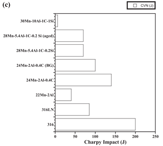 低密度Fe-Mn-Al-C鋼的低溫力學性能。(a):屈服強度(YS)和抗拉強度(UTS);(b):拉伸延伸率(TE);(c):夏比V形缺口(CVN)沖擊功