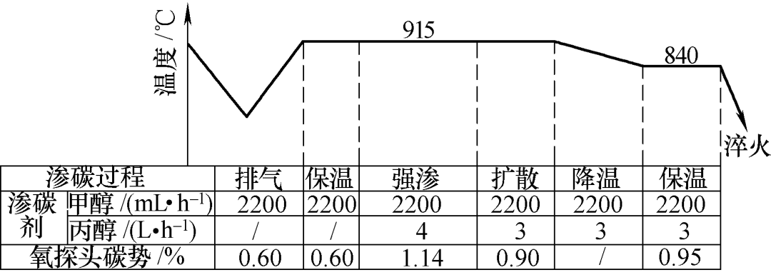齒輪的滲碳、淬火、回火設備采用滴注式氣體滲碳氮化爐自動生產線。齒輪滲碳工藝如圖2所示。