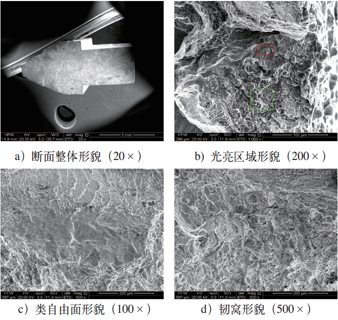 將斷口置于掃描電鏡下進行觀察。斷口部分區域存在類似自由面的特征,其他區域均表現為韌窩特征,形貌如圖2所示。對類似自由面區域以及韌窩區域分別進行能譜分析,主體元素含量基本一致,均未發現氧元素存在,能譜分析結果見表1。